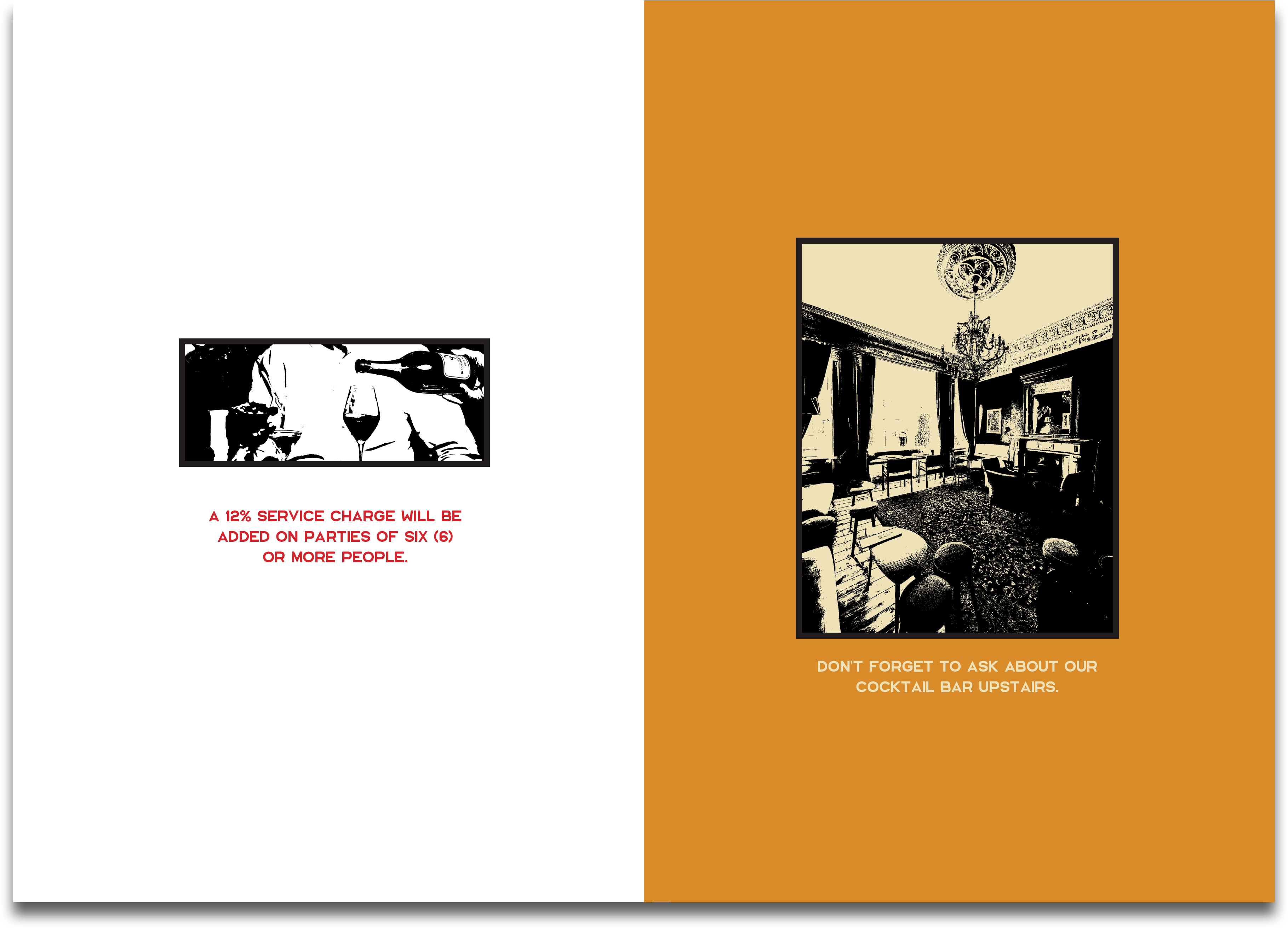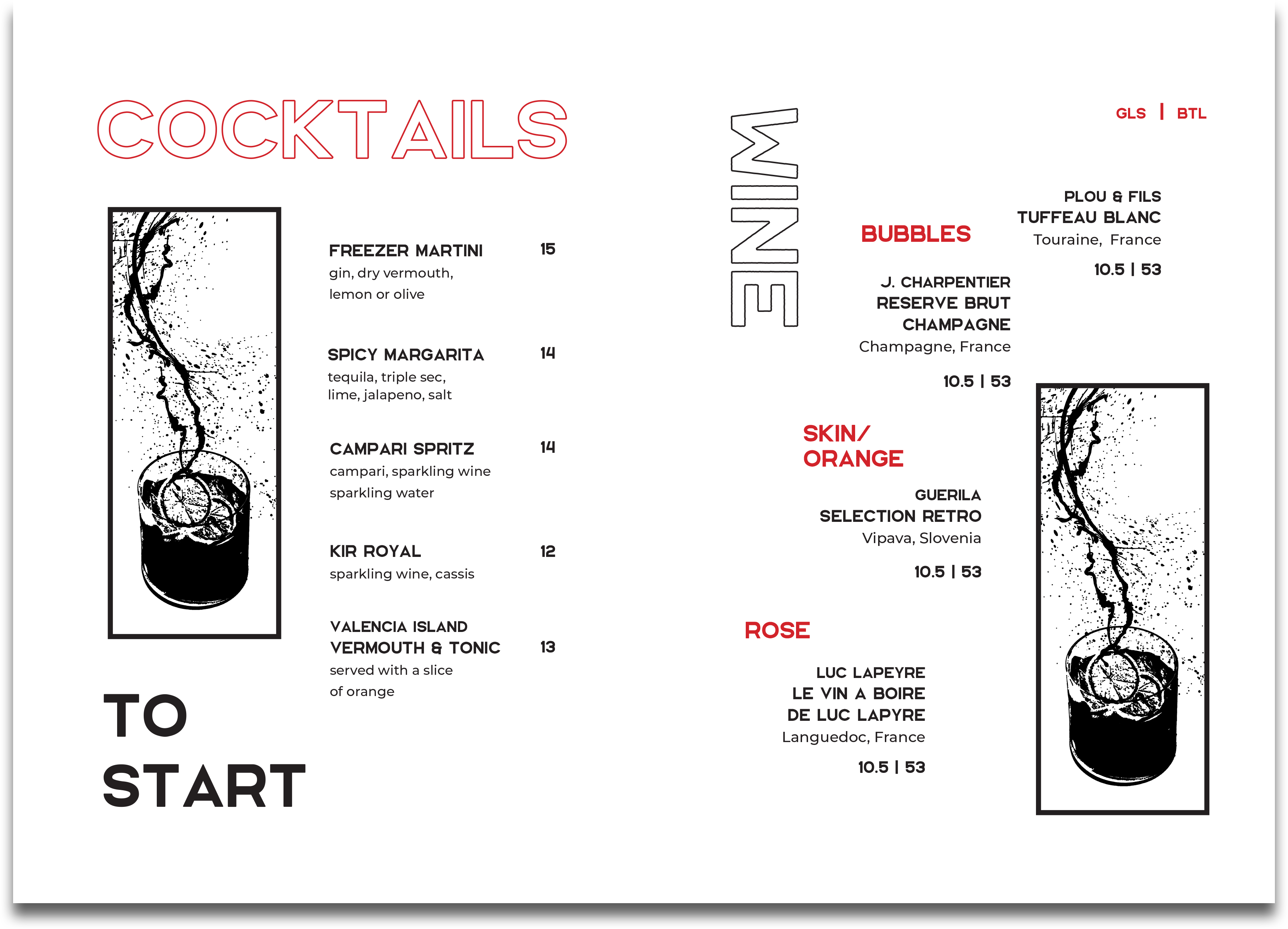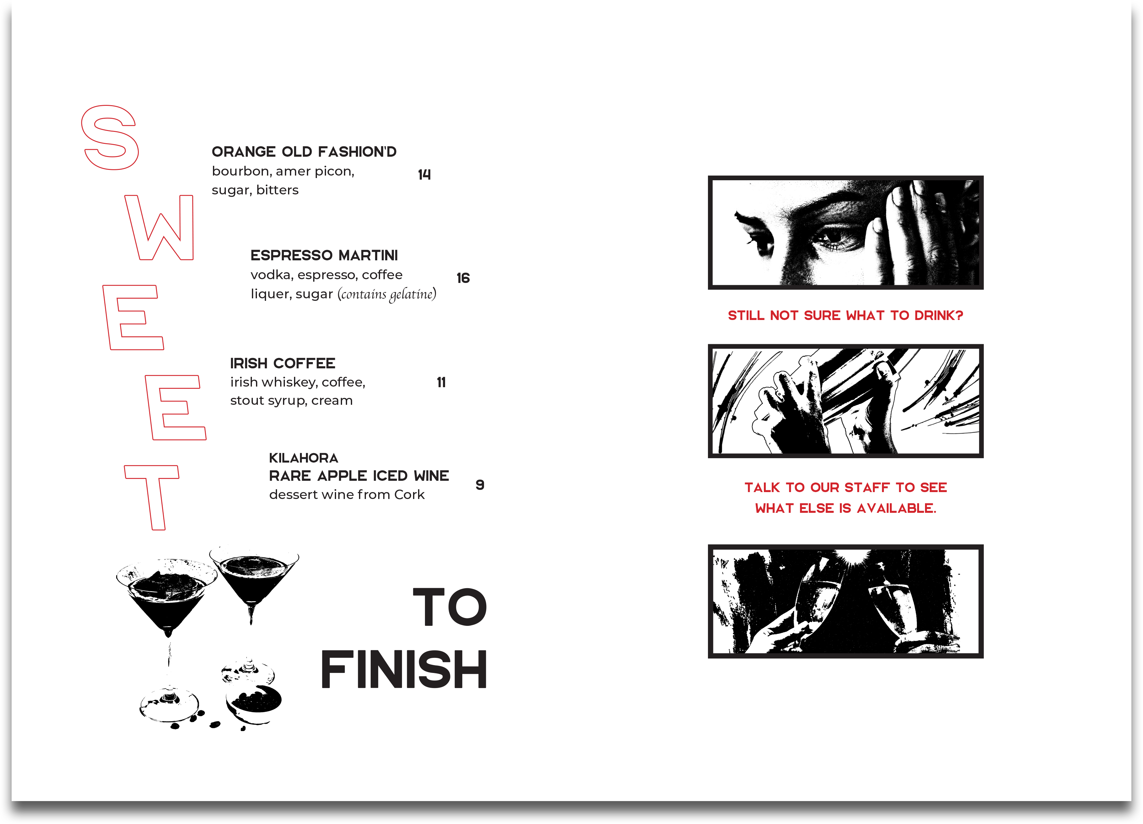 The brief was to reimagine the cocktails menu, updating the restaurant’s classic identity with a contemporary design language that reflects both its literary heritage and the cinematic atmosphere of its bar. The visual approach fuses the timeless, understated elegance of Delahunt with the bold graphic aesthetic of Frank Miller’s Sin City.